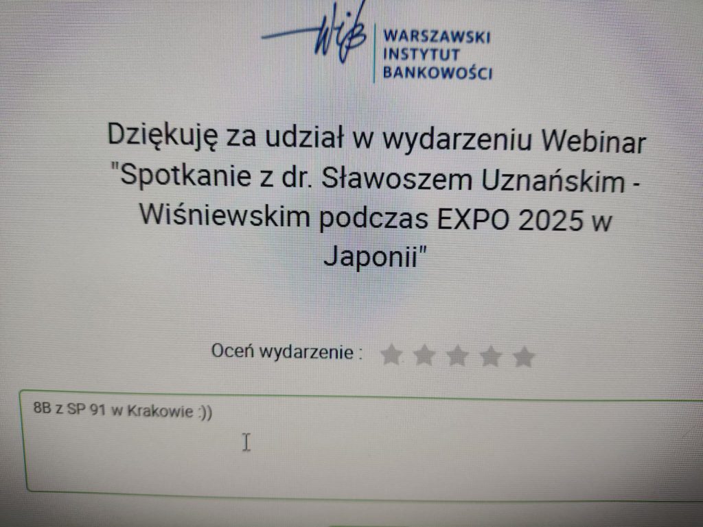 Z wielką radością informujemy, że uczniowie klas 8b i 6a wzięli udział w wyjątkowym wydarzeniu — Spotkaniu Online z dr Sławoszem Uznańskim-Wiśniewskim. Transmisja odbyła się prosto z Polskiego Pawilonu na Expo 2025 w Osace, Japonia!