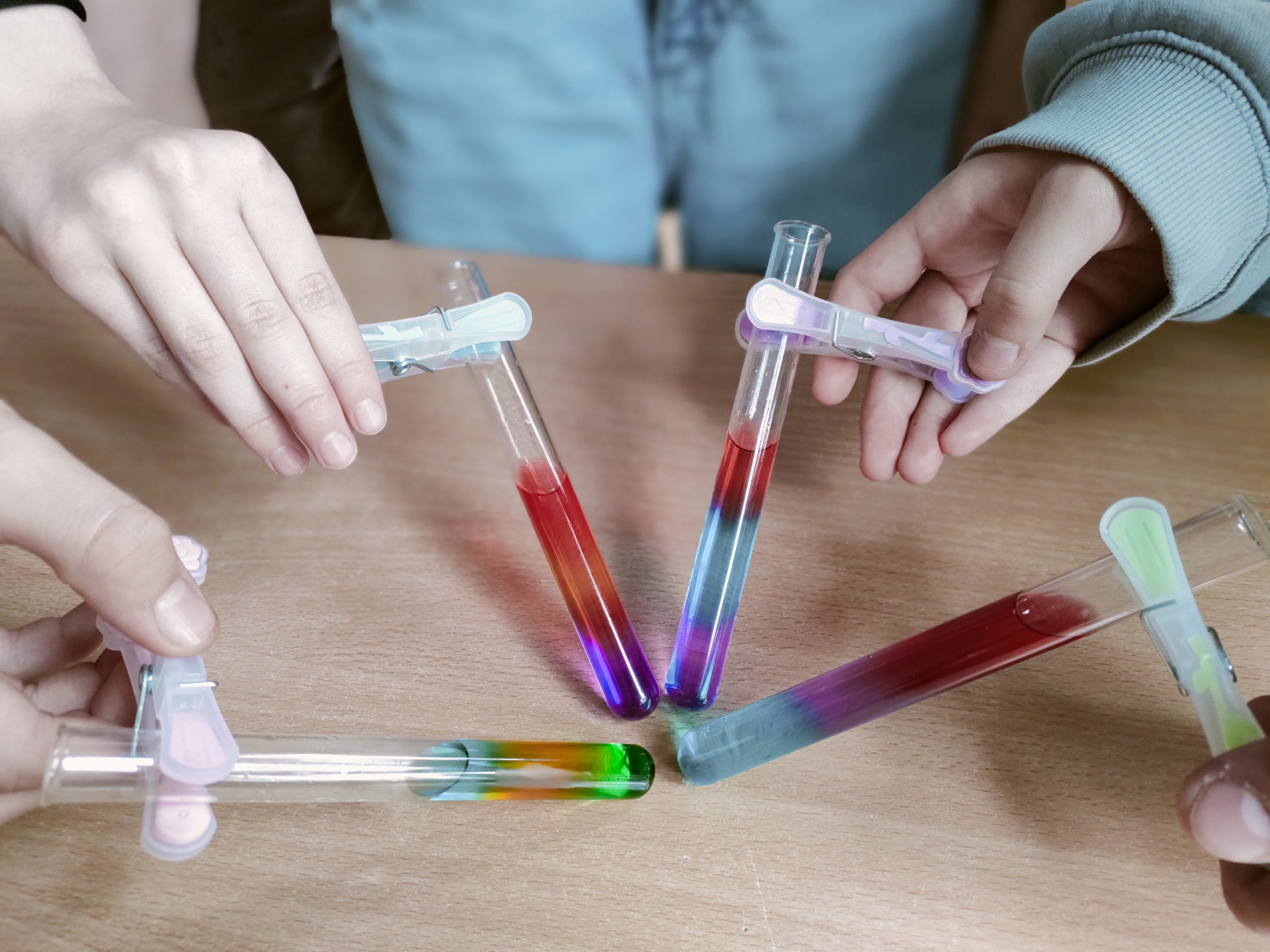 Wykorzystując roztwory cukru o różnym stężeniu i barwniki, uczniowie stworzyli efektowną, wielobarwną tęczę w probówce. Każda warstwa cieczy miała inną gęstość, co pozwoliło na ich uporządkowanie w piękne, kolorowe pasma.