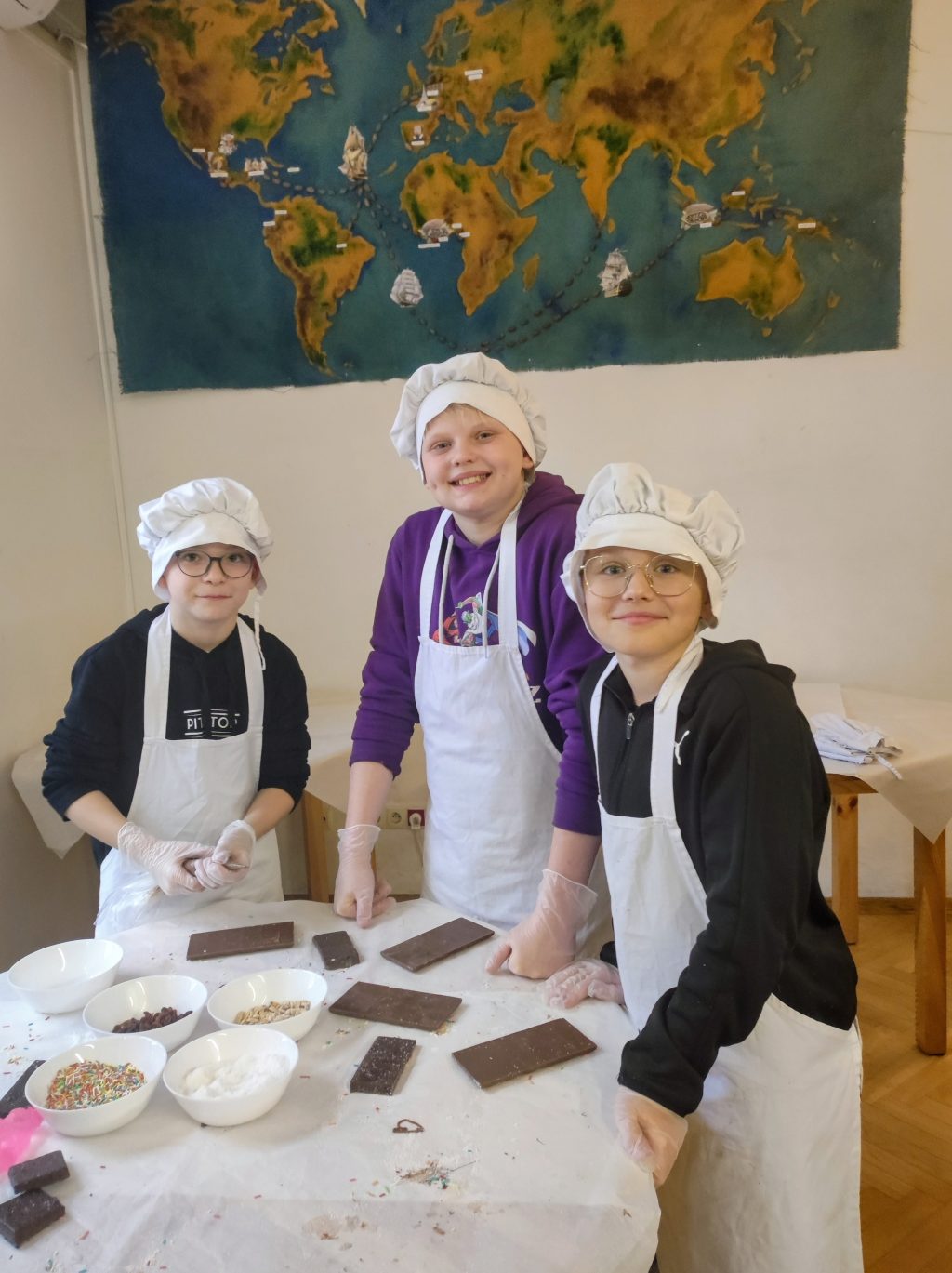W ubiegłą środę klasa 4c wzięła udział w niezwykłych warsztatach edukacyjnych w Fabryce Charliego. Podczas zajęć uczniowie mieli okazję poznać fascynującą drogę, jaką przebywa ziarno kakaowca — od plantacji aż po gotową tabliczkę czekolady. Zdobytą wiedzę mogli następnie sprawdzić w interaktywnym quizie.