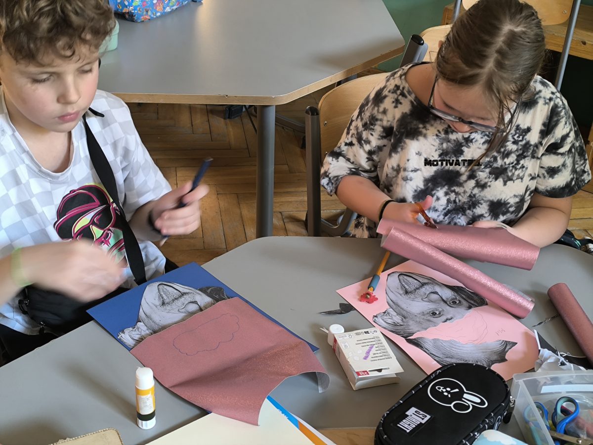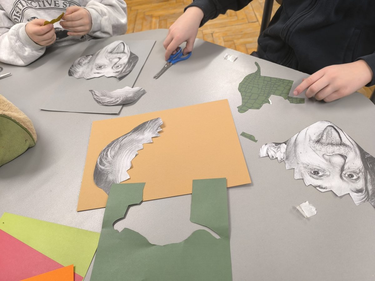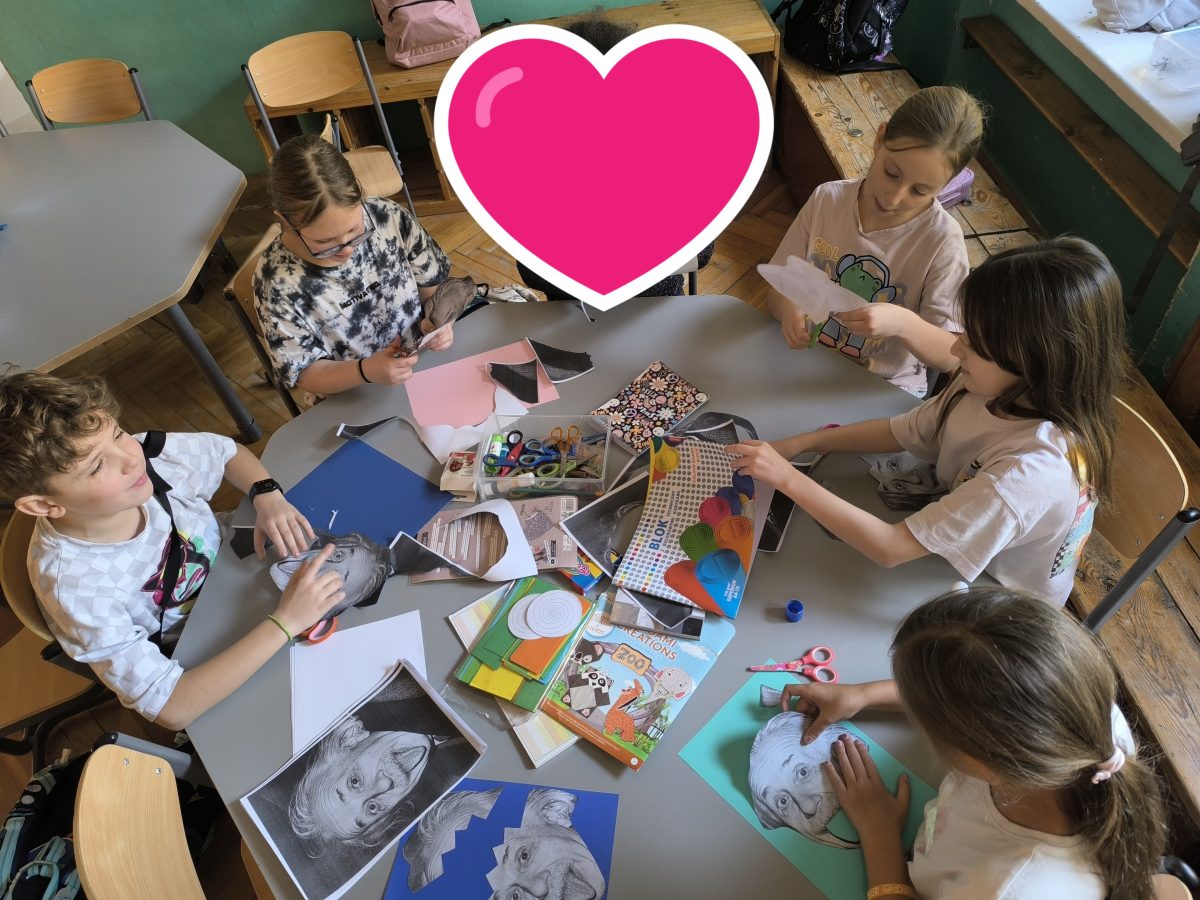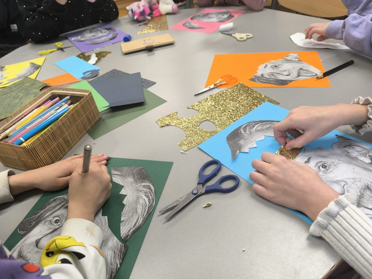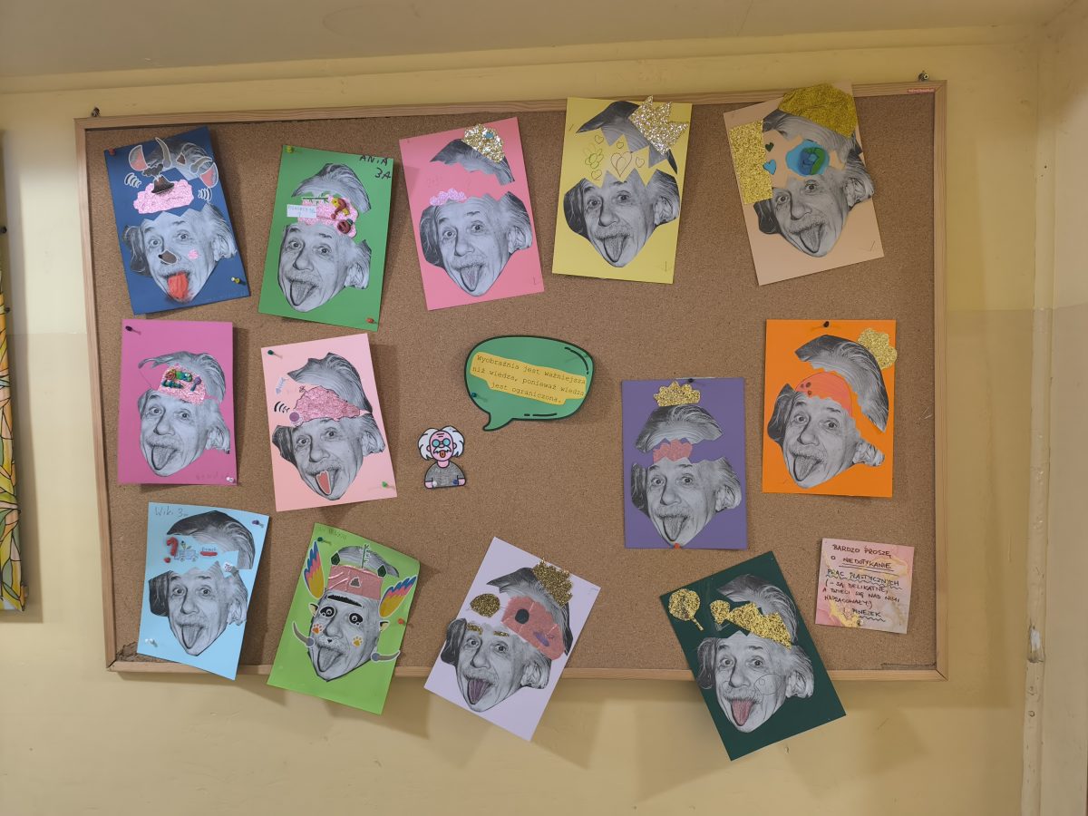 • wykonaliśmy pracę plastyczną z jedną z najbardziej znanych fotografii naukowca z wysuniętym językiem- dzieciaki miały za zadanie zilustrować co oznacza kreatywność 🙂