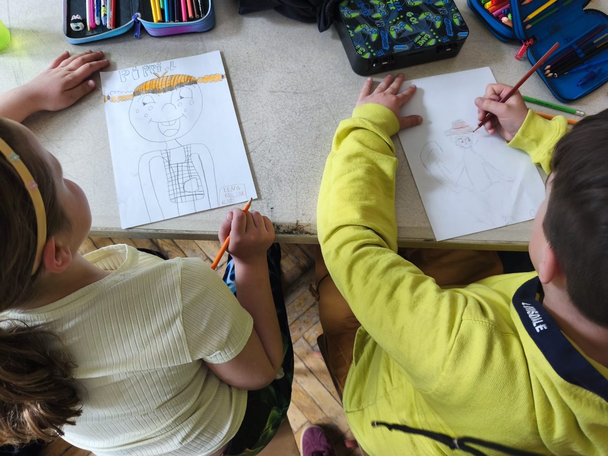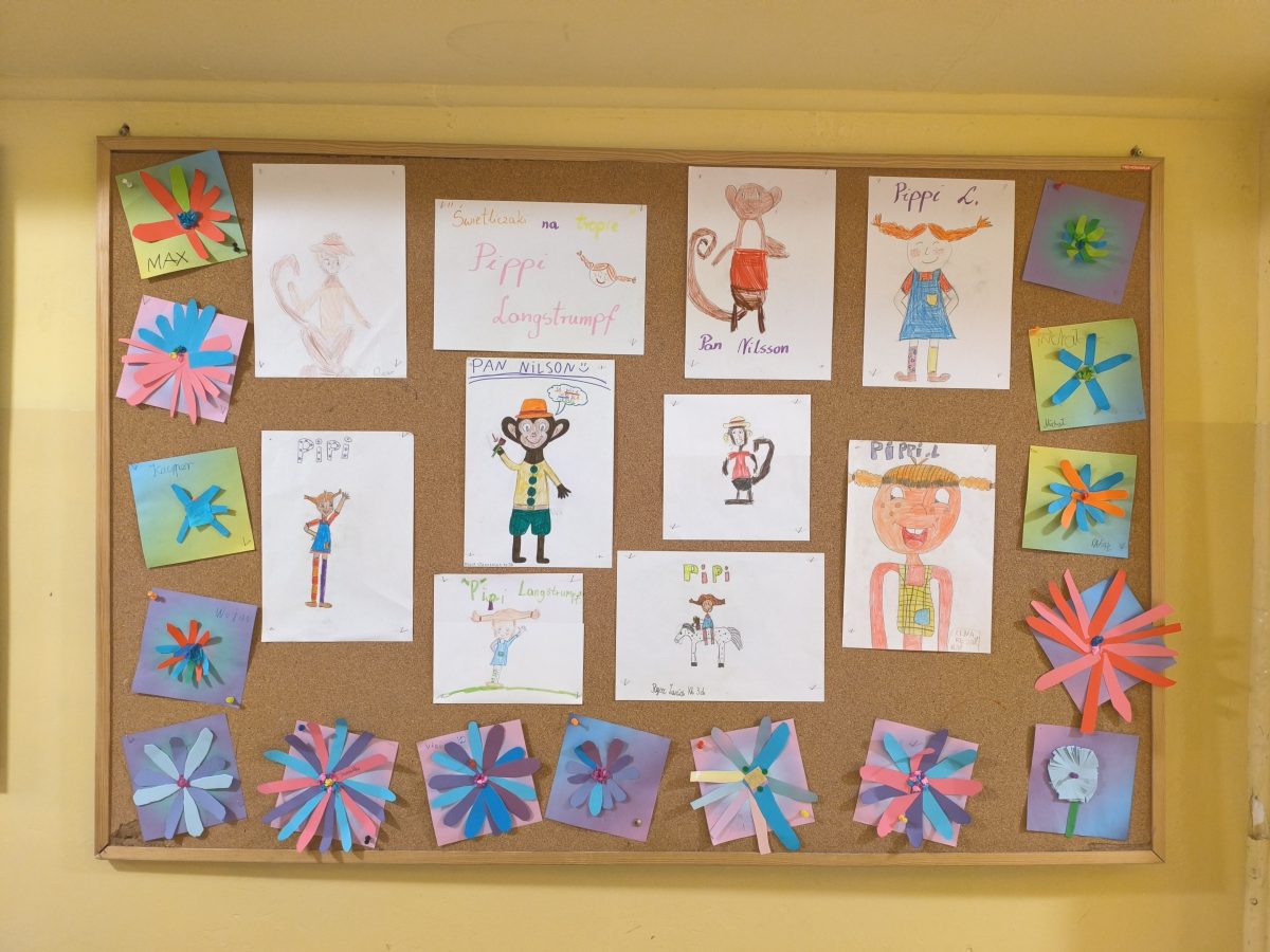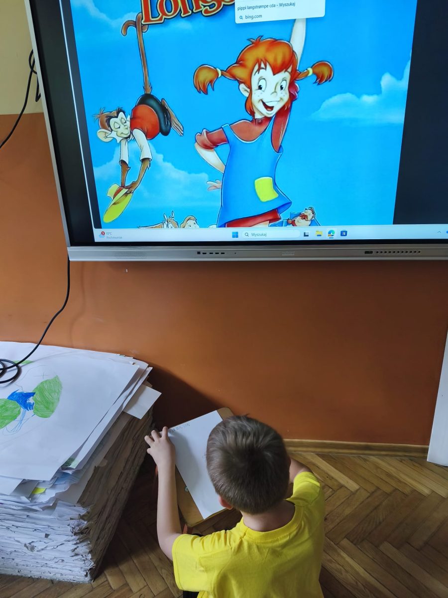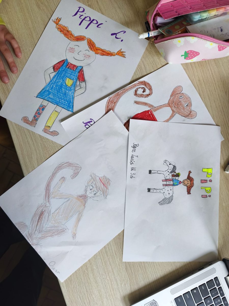 Podczas zajęć obejrzeliśmy bajkę animowaną Pippi Langstrumpf z 1997 roku. Rozmawialiśmy o silnych stronach postaci i sposobach radzenia sobie Pippi w trudnych sytuacjach. Następnie uczniowie rysowali wybrane przez siebie postacie z filmu.