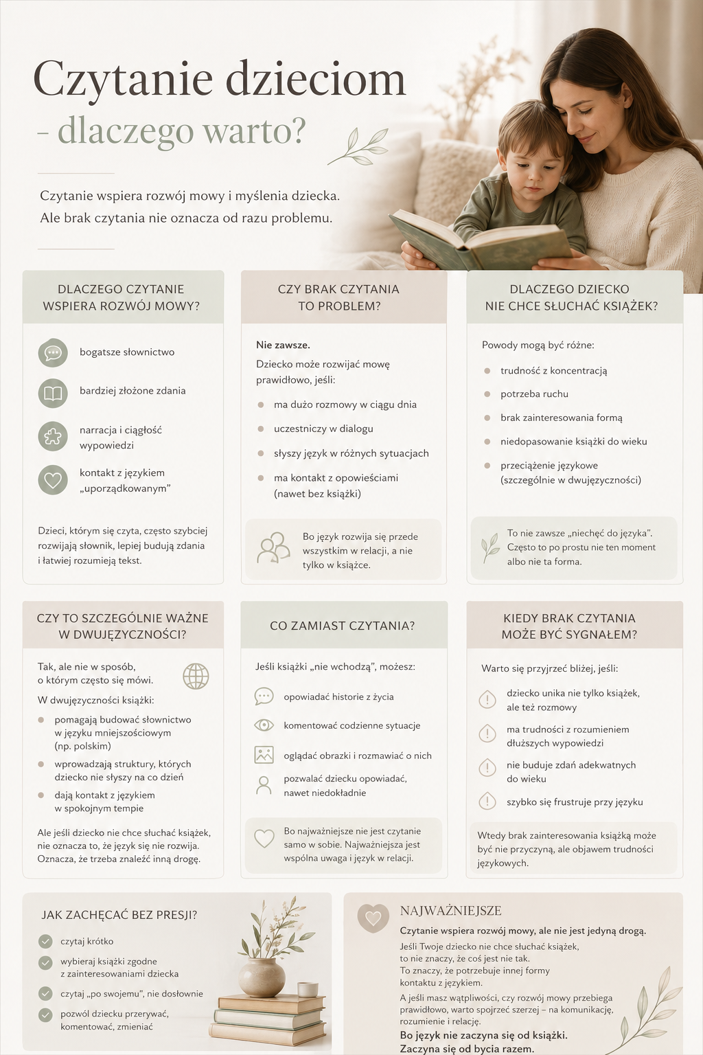 Czytanie dzieciom od lat uznawane jest za jeden z najważniejszych sposobów wspierania rozwoju mowy. Nic więc dziwnego, że wielu rodziców niepokoi się, gdy dziecko nie chce słuchać książek. Jako logopeda warto podkreślić jedno: czytanie bardzo pomaga, ale nie jest jedyną drogą do rozwoju języka.
